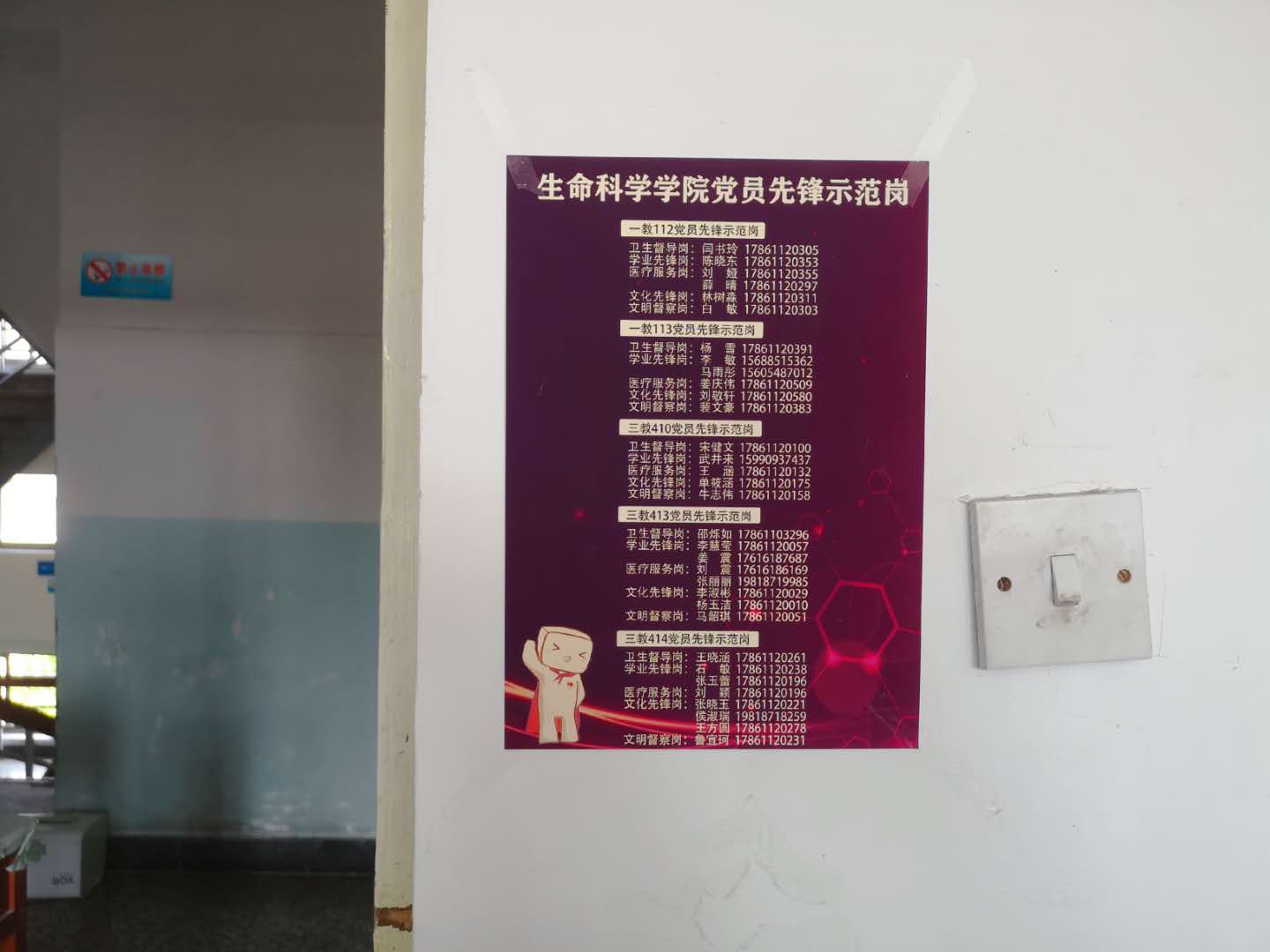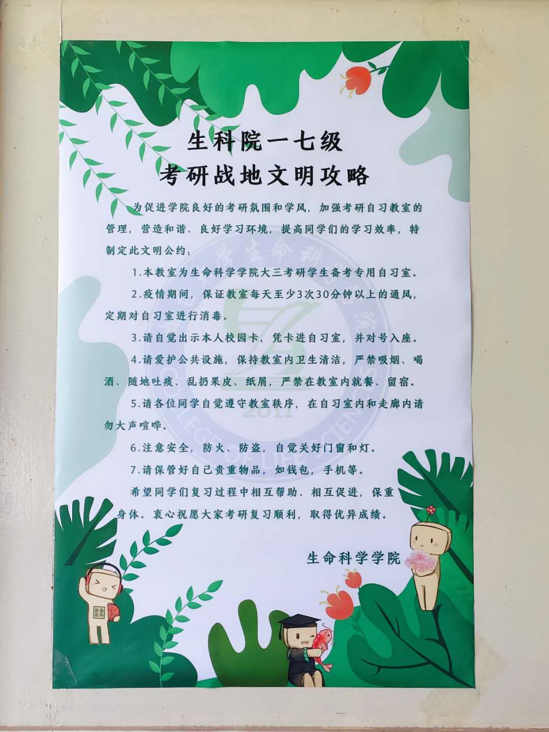“党员先锋岗”分别在第一教学楼、第三教学楼挂牌,返校的17级党员全体上岗,覆盖到全部考研教室,同时将各个岗位的党员进行公示。卫生督导岗保障环境整洁,按照疫情防控要求,确保教室每日三次通风、一人一桌、定期消毒等日常管理。学业先锋岗负责最新备考资讯的搜集整合及发布,对备考过程中出现的问题,进行初步的集中整理,联系或询问专业教师给予解答;医疗服务岗负责管理学院配备的医疗箱、测温仪及藿香正气水、板蓝根、感冒冲剂等常用非处方药,解决封闭期间学生前往校医院的不便;文化先锋岗负责开通文体放松小站,每周播放电影及音乐会视频、组织体育活动等,缓解备考压力;文明督察岗按照《生科院17级考研战地文明攻略》,督促文明言行,确保考研教室安静秩序的学习环境。