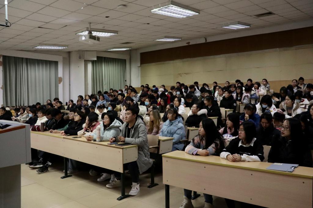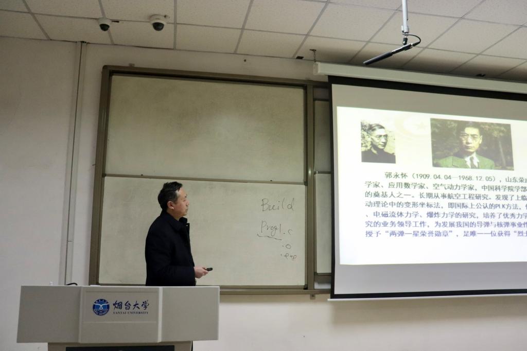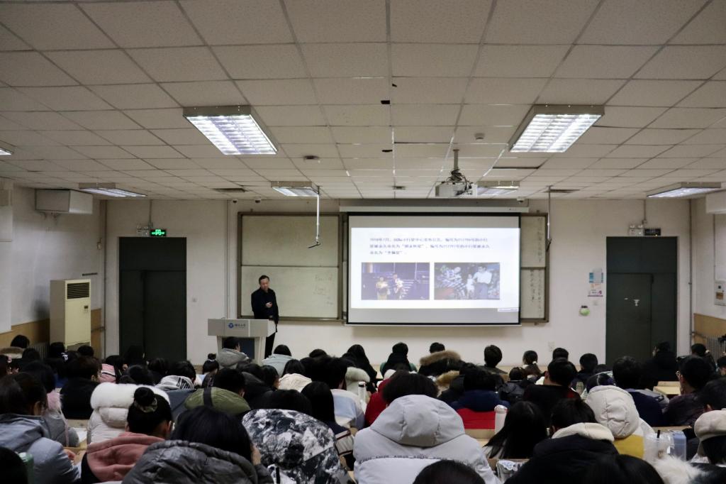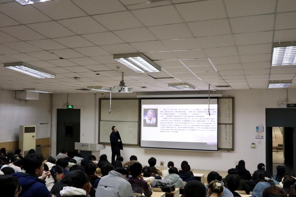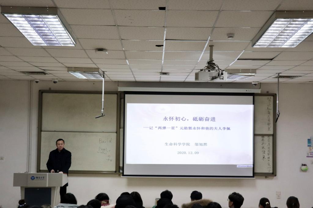 院长邬旭然在第七教学楼402为大一、大二学生骨干讲授思想政治课,主题为“永怀初心,砥砺奋进——记‘两弹一星’元勋郭永怀和他的夫人李佩”。