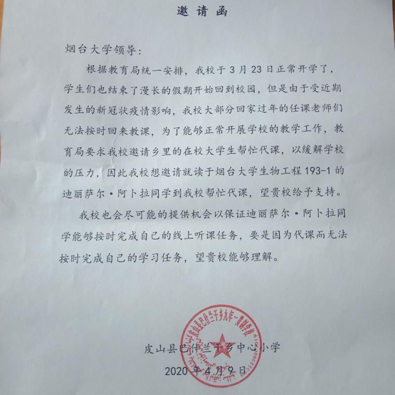 据悉,迪丽萨尔负责巴什兰干乡小学二年级二班的36名小朋友,为他们上道德与法治、朗读和书法课。“我们巴什兰干乡的中小学于 2020 年 3 月 23 日开学,受新冠肺炎疫情影响,不少原岗老师无法及时到校授课,作为大学生的我们按相关部门要求,提前两天到学校做好防疫和教学工作,为接下来的支教做好准备”。当她自己的网课和支教冲突时,其他“老师”会帮忙代课。虽未返“校”,然常在“校”,从大学到小学,“师”与“生”的身份交替点燃了“大学新生”迪丽萨尔的责任感,目前志愿服务已进行了三个多星期,“每当课间和他们一起聊天时,都会想起小时候的自己,我的家庭较贫困,父母的经济压力很大,还有上大学的妹妹和初二的弟弟,但我不会停止求学和助人的热情。现在正处于全球战‘疫’的攻坚阶段,能为国家和社会贡献力量,我感到非常骄傲。”