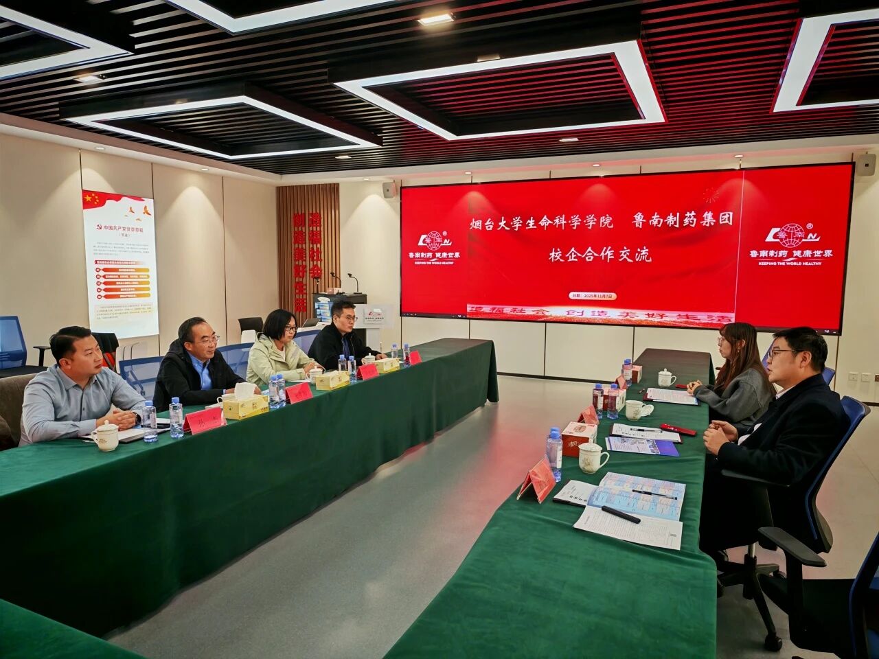 走访期间,学院一行与各企业负责人深入交流,详细了解企业产业结构、发展规划、核心业务及人才招聘标准,重点围绕专业适配度、岗位技能要求、职业发展路径等毕业生关注的问题展开探讨。在鲁南制药,双方举行专题座谈会,就校企合作模式创新、人才联合培养、实习基地建设、岗位需求等实际问题交换意见。学院党总支书记王者旭介绍了学校及学院的发展历史、学科特色、人才培养模式以及 2026届毕业生的基本情况。