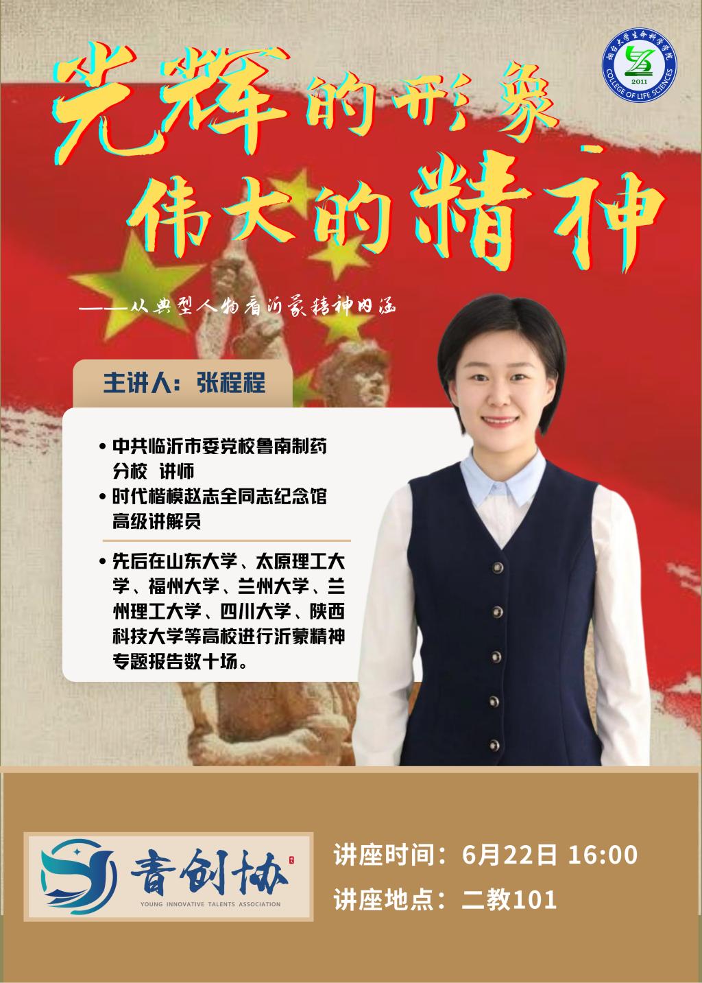 主讲人介绍:张程程,中共临沂市委党校鲁南制药分校 讲师时代楷模赵志全同志纪念馆高级讲解员先后在山东大学、太原理工大学、福州大学、兰州大学、兰州理工大学、四川大学、陕西科技大学等高校进行沂蒙精神专题报告数十场。