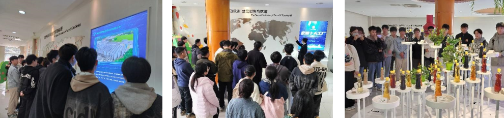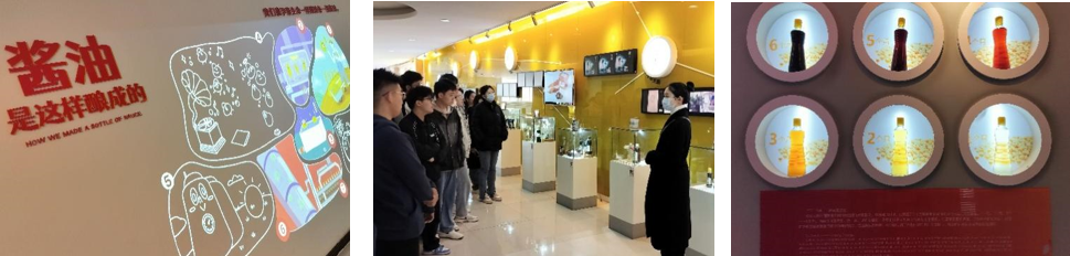 从大厅的米其林展走到二楼迷你农场,在小剧场观看企业宣传片后,穿越室内工艺走廊,在讲解员的介绍中,师生逐步了解到企业发展史、企业塑造理念、食品文化科普、“精品”酱油酿味专业知识等,收获颇丰。